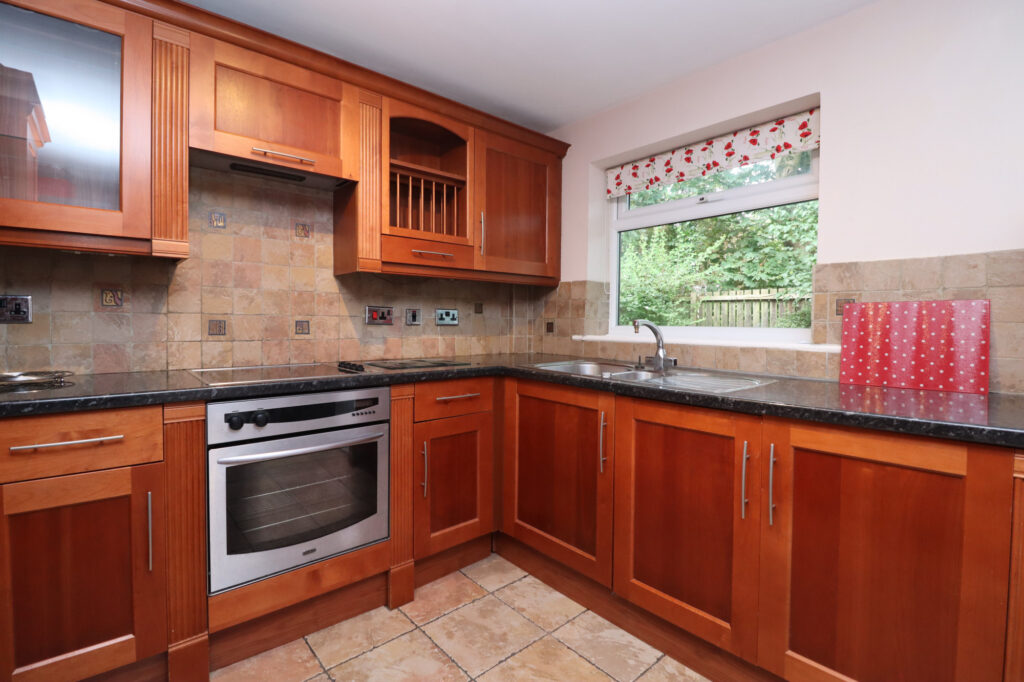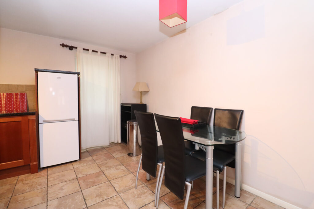 The kitchen is well-equipped with ample wall and floor storage units, built-in appliances, and a stainless steel sink with drainer. There is also space for a dining table, enhancing the kitchen's practicality. From the kitchen/diner, you have direct access to the rear garden, providing a pleasant outdoor space.