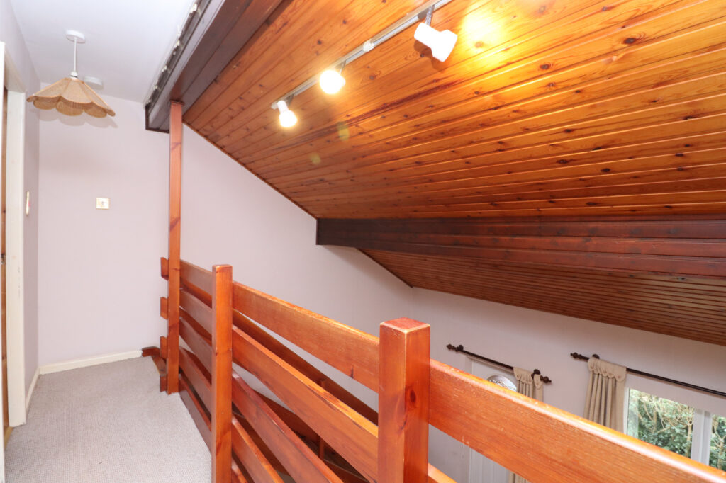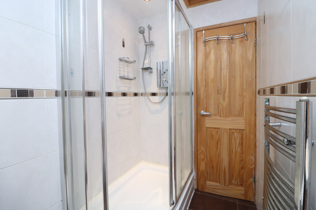 Upstairs, the open gallery-style bedroom features a built-in storage closet and a modern three-piece shower room. The shower room includes a corner shower, toilet, and wash hand basin, all finished to a high standard.