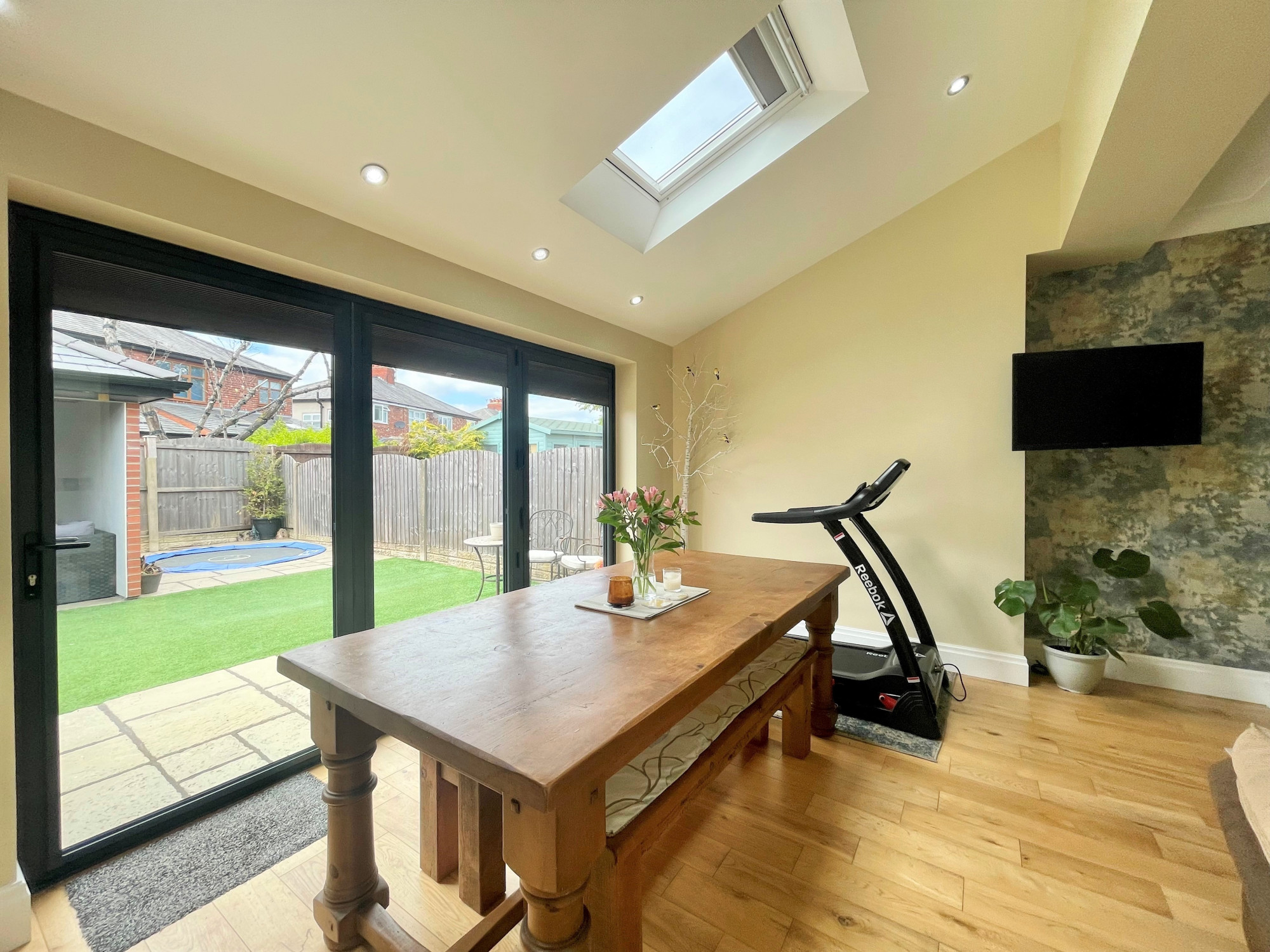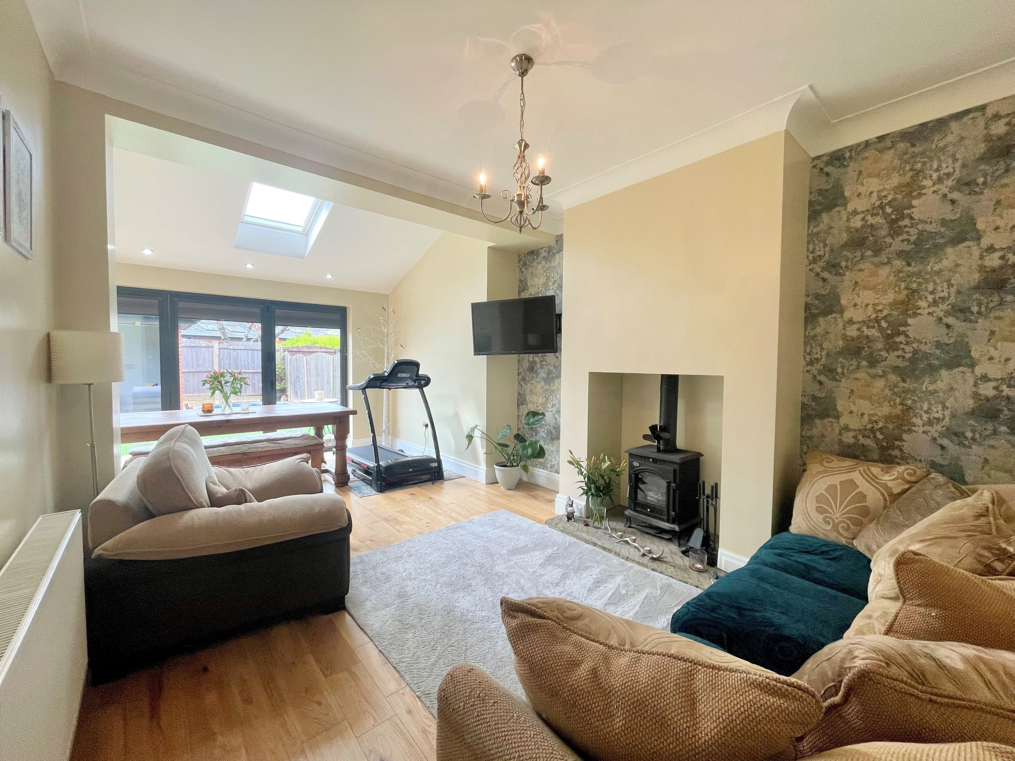 On internal inspection the property briefly comprises; entrance porch, spacious entrance hallway, lounge with a bay window and a log burner, family room with bi-folds leading out to the rear,veluxΒ windows and a log burn, a modern fitted kitchen with a range of integrated appliances. To the first floor there is three bedrooms and a family bathroom. On external inspection; front & rear gardens, driveway providing off road parking and a detached garage. Viewing is highly recommended to appreciate the accommodation on offer.