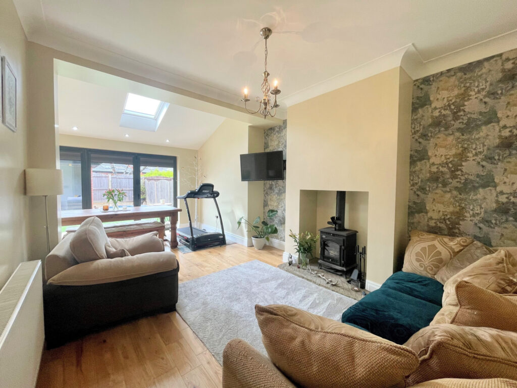 On internal inspection the property briefly comprises; entrance porch, spacious entrance hallway, lounge with a bay window and a log burner, family room with bi-folds leading out to the rear,velux windows and a log burn, a modern fitted kitchen with a range of integrated appliances. To the first floor there is three bedrooms and a family bathroom. On external inspection; front & rear gardens, driveway providing off road parking and a detached garage. Viewing is highly recommended to appreciate the accommodation on offer.