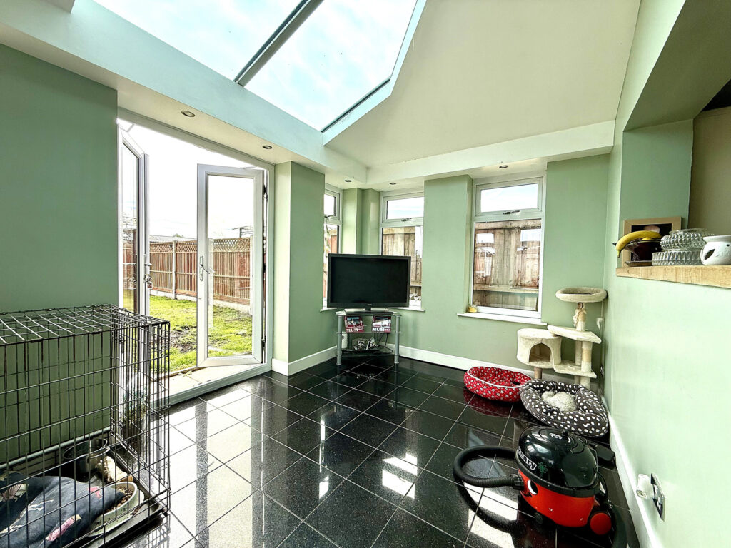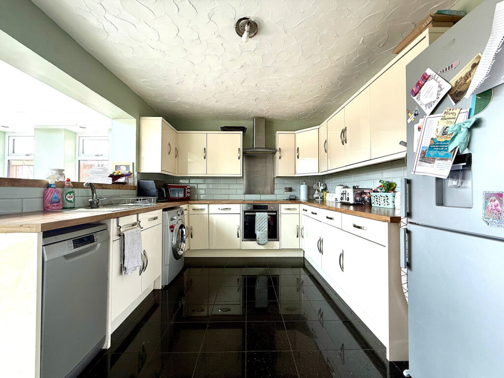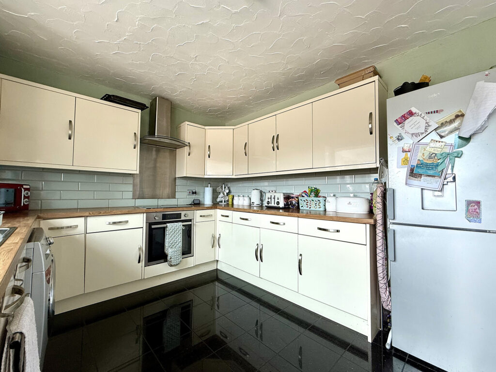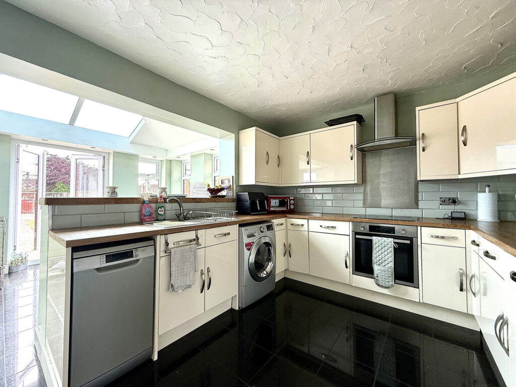 Upon entering this delightful residence, you are immediately greeted by a welcoming hall. Staircase access leads to the upper floor, with a convenient storage cupboard thoughtfully positioned for everyday convenience. The hallway provides seamless access to all of the ground floor accommodation. The generously proportioned lounge offers a comfortable and relaxing atmosphere, enhanced by a large window that floods the room with natural light. A charming feature fireplace serves as a focal point, creating a cosy ambiance – perfect for quiet evenings or gatherings with loved ones. A further storage cupboard provides practical solutions for keeping the living space uncluttered. The family-sized kitchen is a true highlight, boasting a contemporary design with a full complement of fitted wall and base units. Complementary worktops and splash backs offer both style and practicality. Equipped with dedicated space and plumbing for both a washing machine and dishwasher, this kitchen is designed to simplify daily life. The kitchen seamlessly flows into an open-aspect dining area, creating a wonderful space for family meals and entertaining. Large patio doors open onto the rear garden, blurring the lines between indoor and outdoor living. Further windows to both sides, coupled with a strategically placed skylight, ensure this space is bathed in natural light throughout the day.
