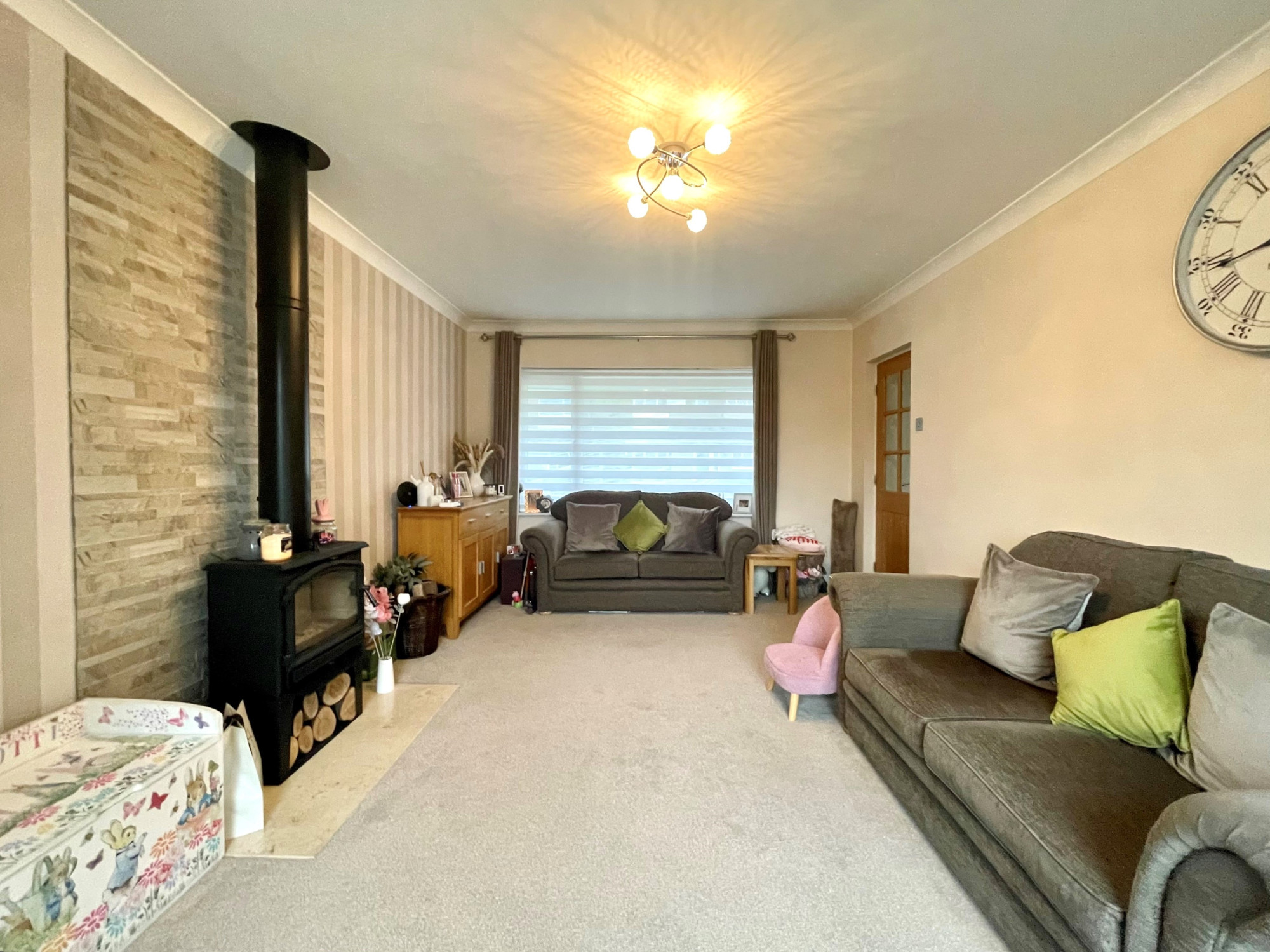 The lounge enjoys a spacious feel with sliding doors out to the rear garden, finished with a log burner. Whilst the dining/second reception room opens out into the kitchen, fitted with a range of wall and base units.