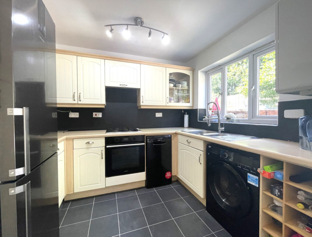 Step inside to a bright, open-plan lounge that creates a warm and sociable living area, flowing effortlessly into a contemporary dining kitchen complete with fitted units and white goods. A convenient downstairs WC adds extra practicality.
