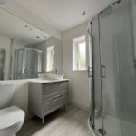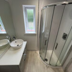 The pristine bathroom features contemporary fixtures and fittings, exuding sophistication and style. Featuring Three peiceΒ show room with corner shower, Wash hand basin and Toilet.