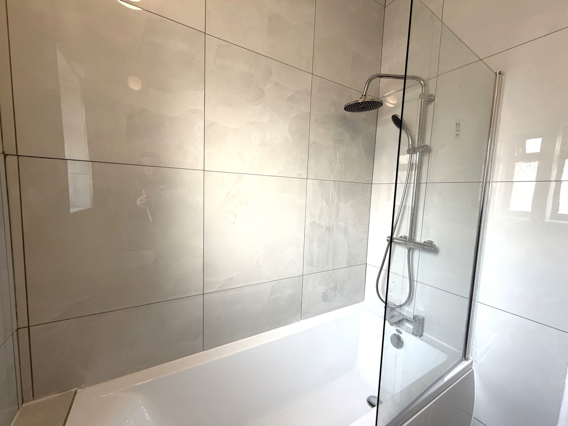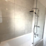 The main bathroom has been completed to a contemporary specification and benefits from full-height wall tiling, a shower over bath, and a modern three-piece suite, creating a clean and stylish finish.