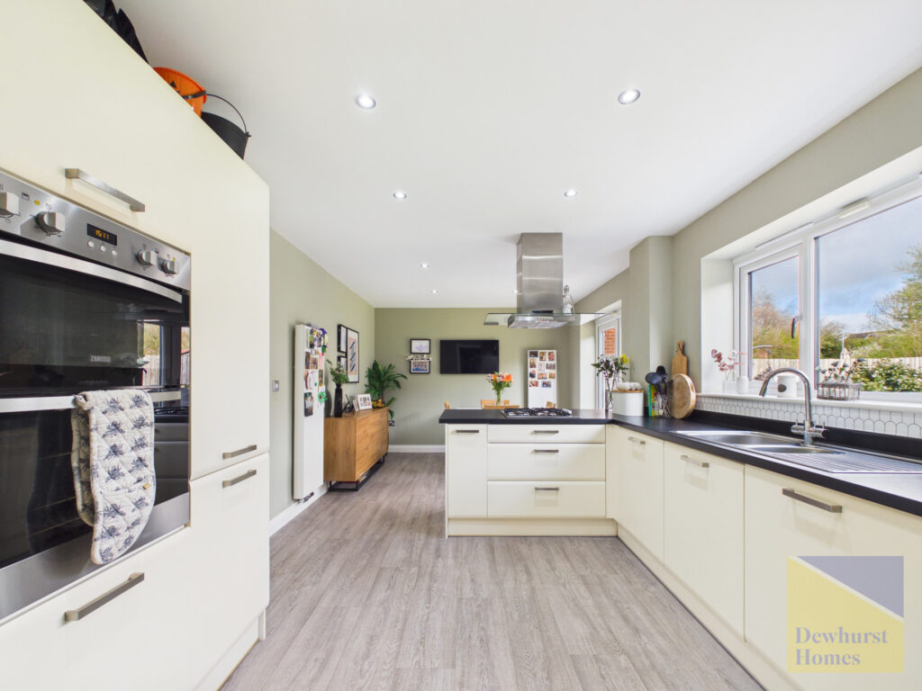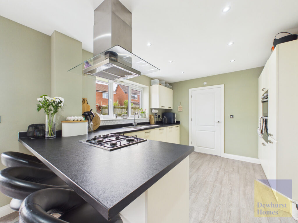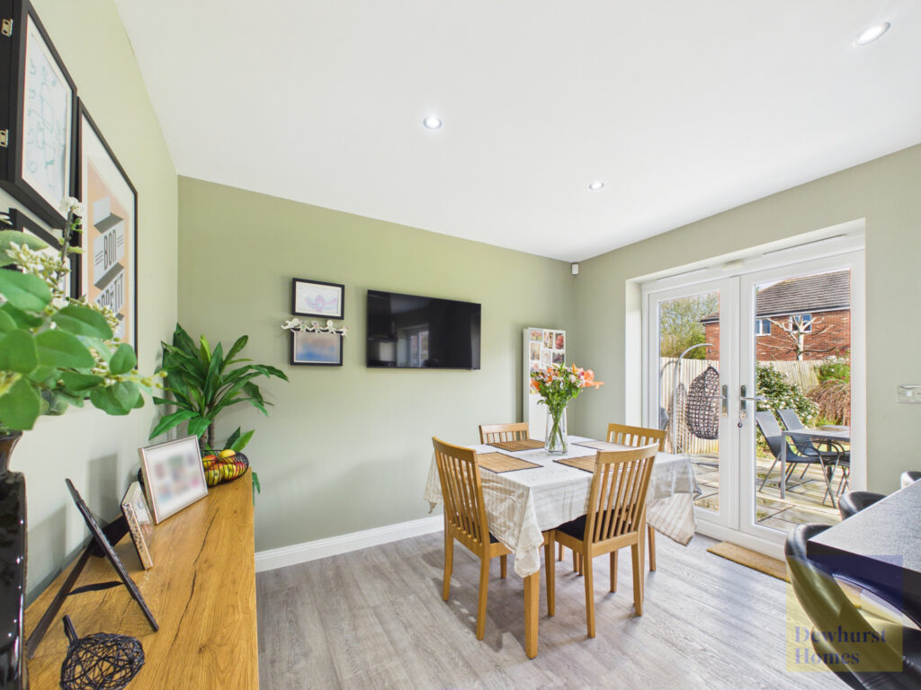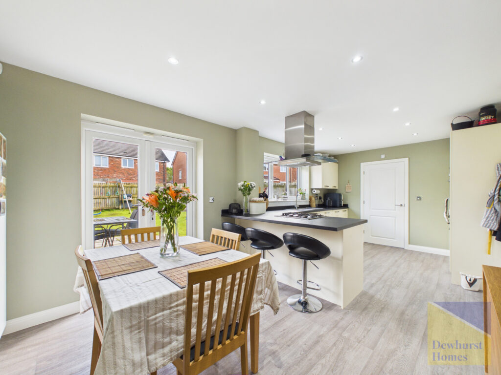 To the rear, the home truly comes into its own with a stunning open-plan dining kitchen that forms the heart of daily life. Thoughtfully designed, this space features a comprehensive range of modern wall and base units, sleek work surfaces, and a stylish breakfast bar, ideal for casual dining or morning coffee. There is ample room for a full-sized dining table and chairs, making it a fantastic setting for family meals and social gatherings. Double glazed French doors open directly onto the rear garden, allowing natural light to flood in and creating a seamless connection between indoor and outdoor living.