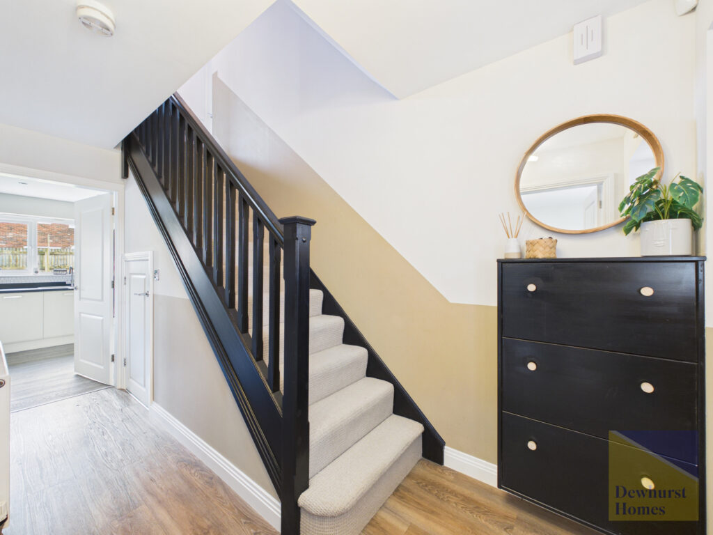 Stepping inside, the welcoming entrance hallway sets the tone for the rest of the home, offering a bright and airy introduction with a staircase leading to the first floor. The living room, positioned to the front of the property, is beautifully decorated in a contemporary style and enjoys an abundance of natural light thanks to a striking bay window. This is a warm and inviting space — perfect for cosy evenings in or entertaining guests.