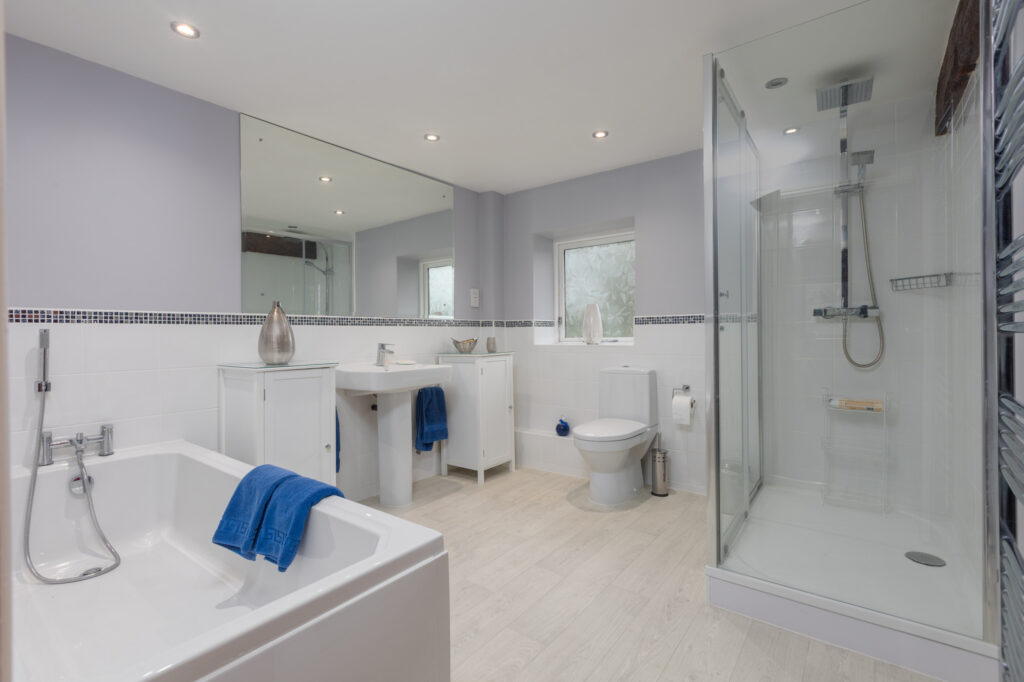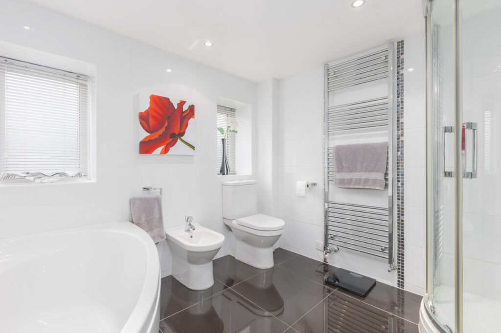 The first floor has a large landing area with doors that lead off to all bedrooms. The main bedroom comes with plenty of storage thanks to built-in wardrobes and benefits from its own en-suite bathroom. Bedroom two comes with fitted storage, sitting space and its own en-suite shower room. Also, off the landing you will find three more great size double bedrooms, a large family bathroom with modern white fittings and separate shower.