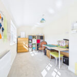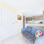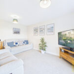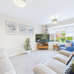 Upon entering, you are welcomed into a bright and inviting interior, where the sense of space and light is immediately apparent. The principal reception room is a beautifully proportioned lounge, offering a calm and sophisticated retreat for relaxation, enhanced by generous windows that frame views of the surrounding greenery.
