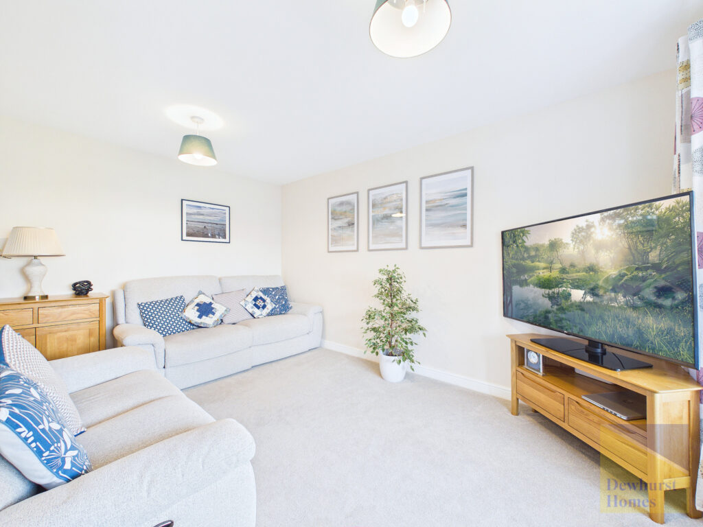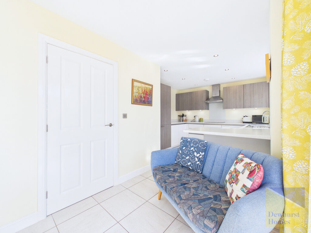 Upon entering, you are welcomed into a bright and inviting interior, where the sense of space and light is immediately apparent. The principal reception room is a beautifully proportioned lounge, offering a calm and sophisticated retreat for relaxation, enhanced by generous windows that frame views of the surrounding greenery.