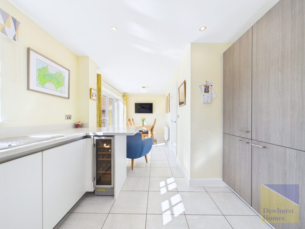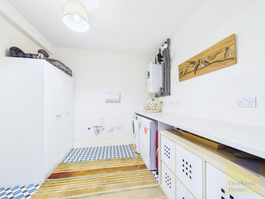 At the heart of the home lies an impressive open-plan kitchen and dining space, meticulously designed with a sleek, modern aesthetic. Featuring high-quality integrated appliances, streamlined cabinetry, and ample workspace, this area is as functional as it is stylish. The dining area seamlessly connects to the garden, creating a superb setting for both intimate family meals and larger social gatherings. A separate utility room, thoughtfully added provides additional practicality, while a contemporary ground floor W/C completes the layout.