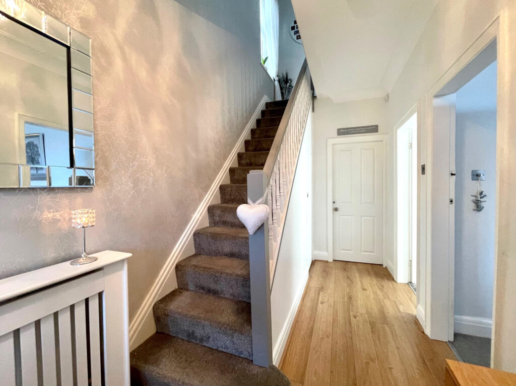 Access is gained via the entrance recessed porch leading into a spacious entrance hall, which has a staircase to the first-floor accommodation and useful under stairs storage. The lounge to the front comes with a large bay window and feature fireplace, whilst to the rear of the house, the dining room also enjoys a feature media wall and a sliding door out to the garden. The kitchen has ample storage and plenty of work surface space for food preparation.