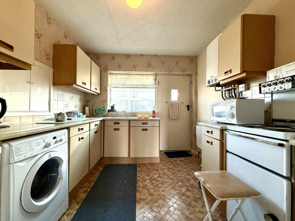 Enter through the front porch into a spacious hallway, with a convenient W.C off to one side. The generous lounge flows into an open-aspect dining room with a serving hatch, ideal for entertaining. The kitchen is fitted with a wide range of wall and base units and utilities, with access into a rear garden room that adds extra living space and opens to the outdoors. Ascend the stairs to two double bedrooms and a neat three-piece bathroom. A handy laundry cupboard provides practical storage and organisation.