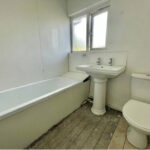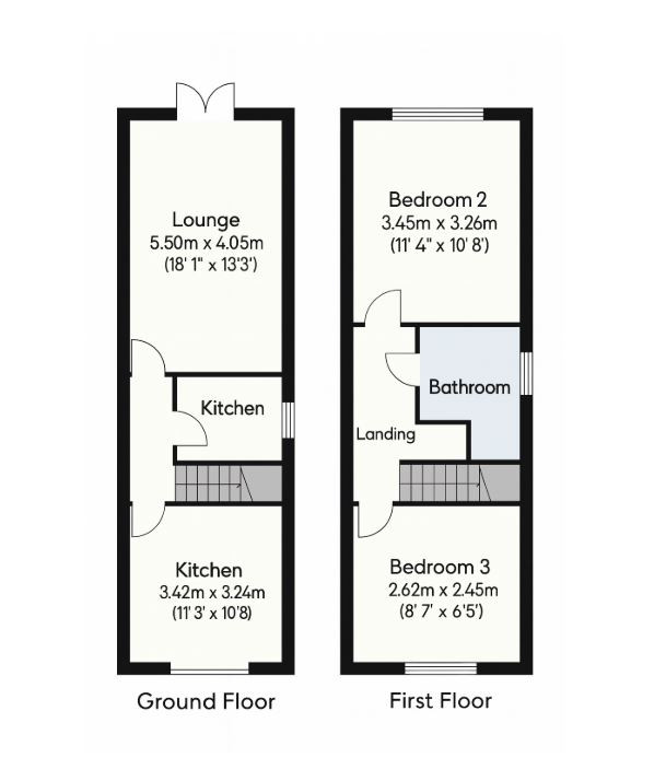The first-floor landing is accessed via the main staircase and includes a double glazed window to the front. Bedroom One (3.45m x 3.26m) offers a double glazed window to the rear, fitted wardrobes, and a radiator. Bedroom Two (3.6m x 3.45m) also has a rear-facing double glazed window, fitted wardrobes, and a radiator. Bedroom Three (2.62m x 2.45m) includes a double glazed window to the front, a radiator, and laminate flooring. The bathroom (2.02m x 1.96m) is fitted with a bath, wash basin, low flush WC, radiator, and a double glazed window to the front.