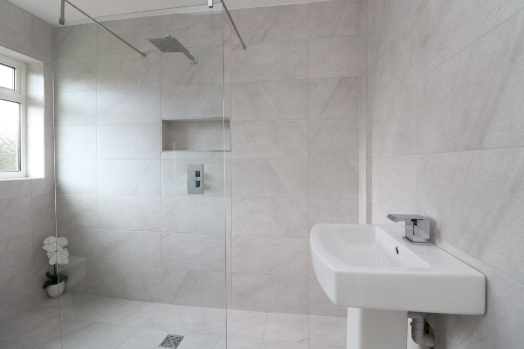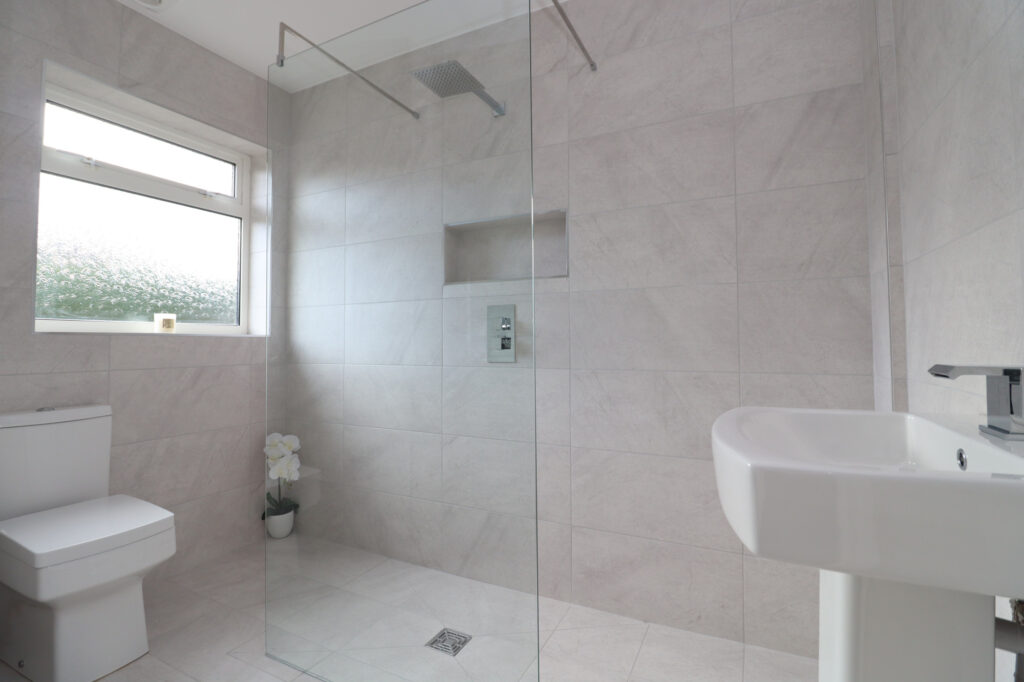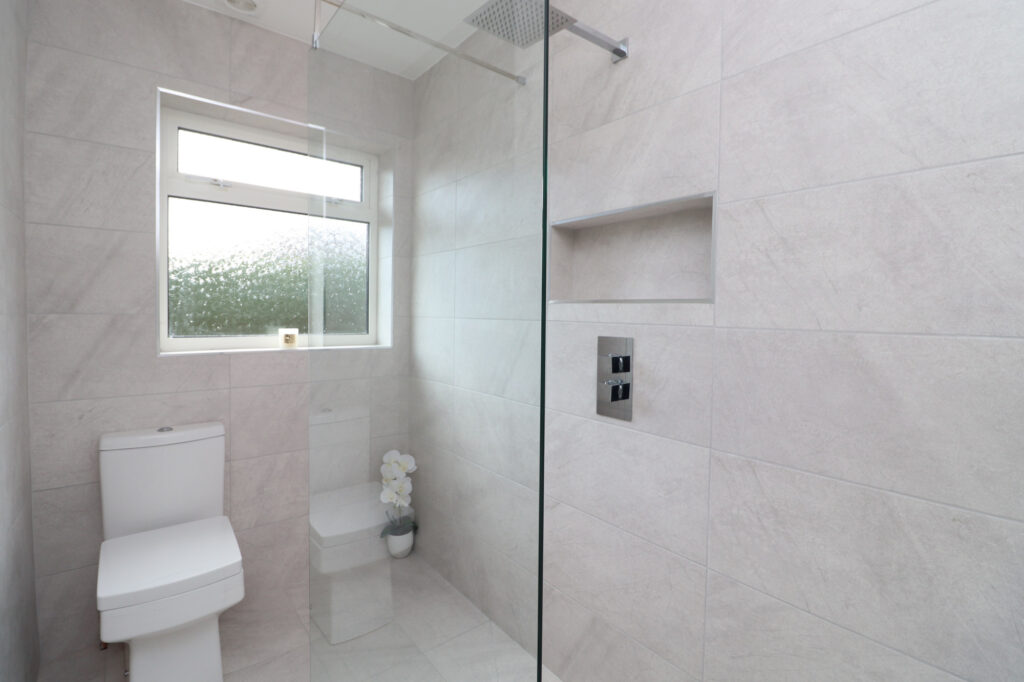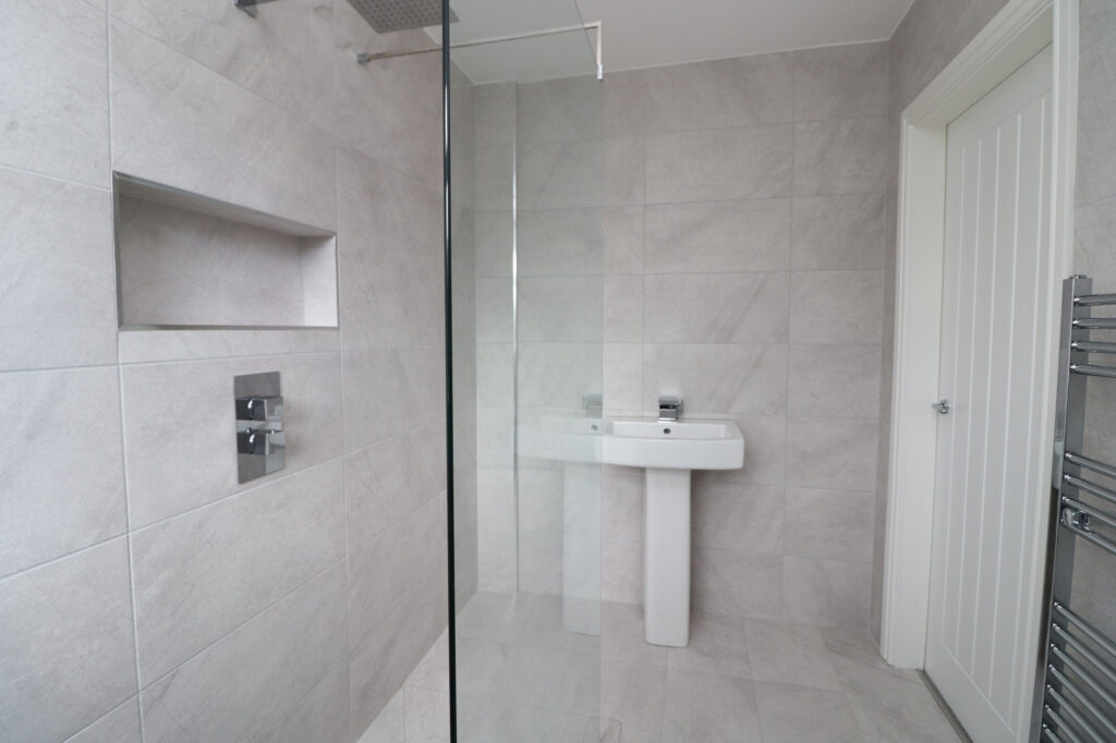 The modern shower room features a three-piece suite with walk in rainfall shower, toilet, and wash hand basin. The finish is excellent, and thought has been taken with the layout to make the best use of the space with a glass panel separating the shower from the rest of the room.