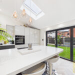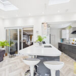 Undoubtedly the heart of the home is the stunning extended family dining kitchen. Finished with herringbone Amtico flooring, this impressive space has been designed with both everyday living and entertaining in mind. The kitchen is fully equipped and includes a five-ring hob, extensive storage and worktop space, and a stylish bar area complete with seating. Bifold doors open onto the rear garden, while internal patio doors connect seamlessly to the lounge, creating a flexible and sociable layout filled with natural light. A convenient downstairs WC completes the ground floor accommodation.