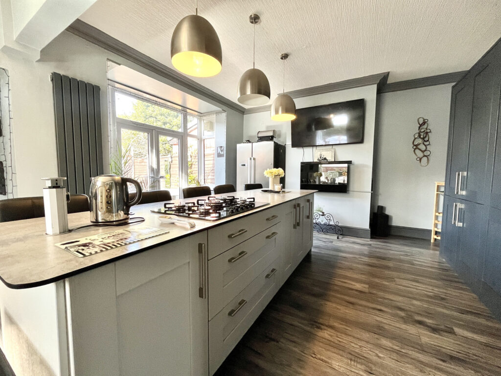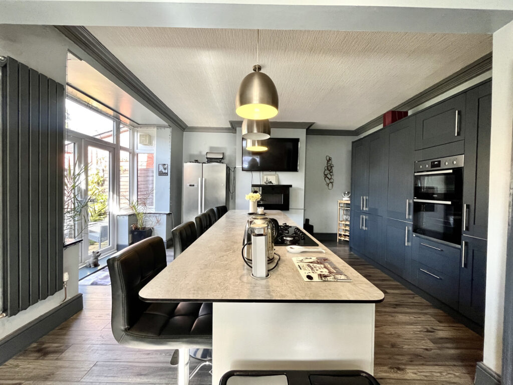 Stepping inside, you are welcomed by a bright and airy hallway, leading to a generous bay-windowed living room, which floods the space with natural light. The heart of the home is the large kitchen diner, offering ample space for cooking, dining, and entertaining. A downstairs cloakroom with WC adds to the practicality of the ground floor.