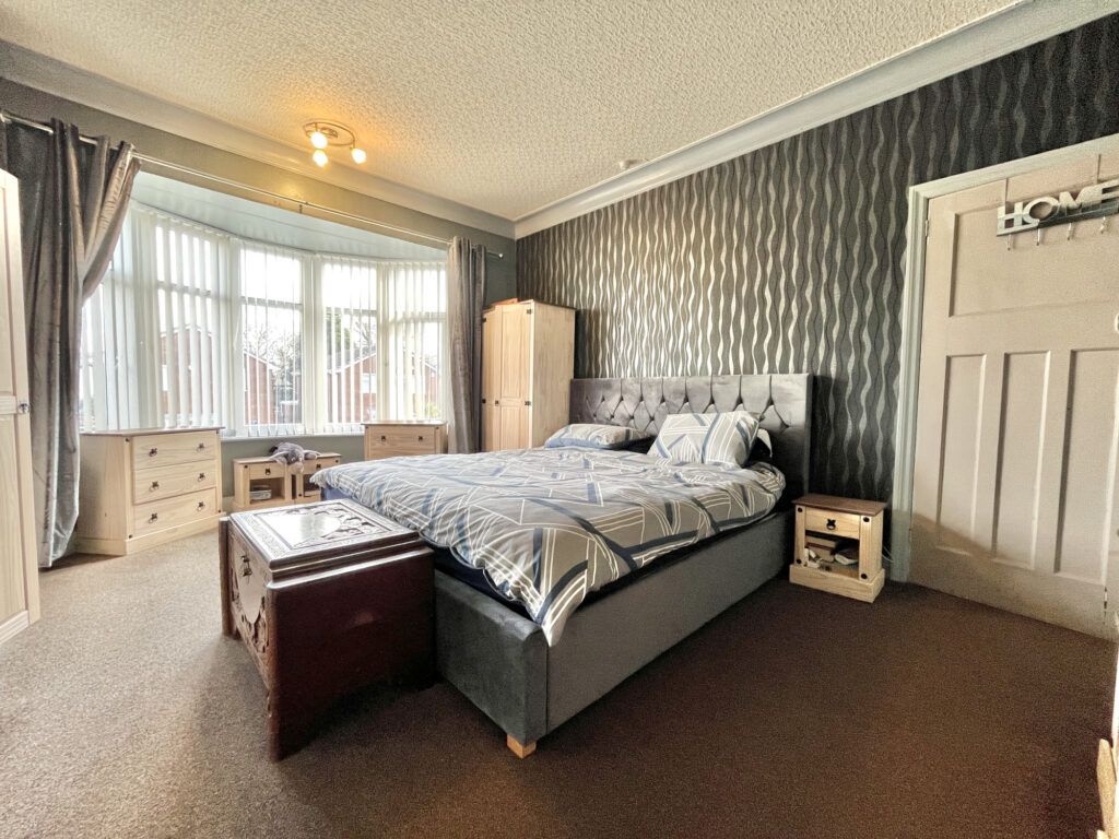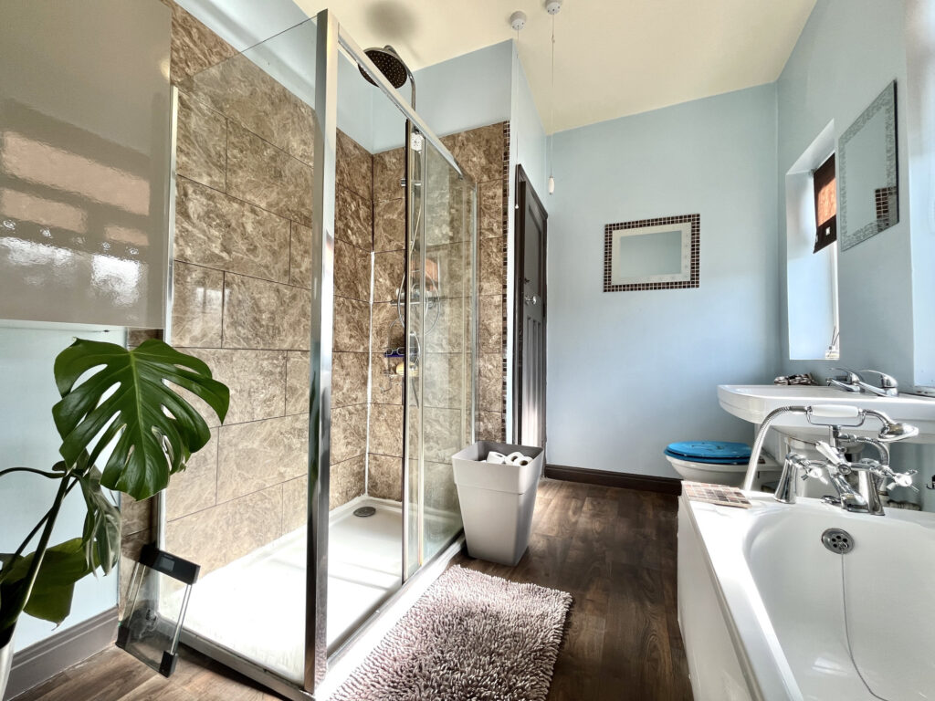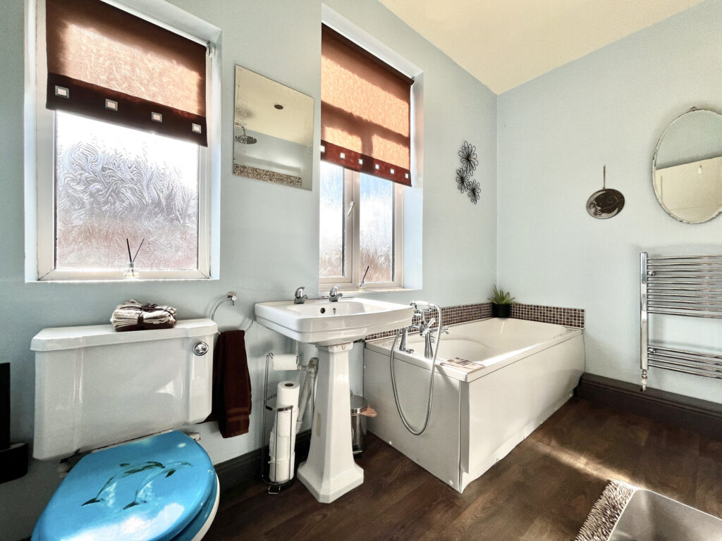 Upstairs, the property features three well-proportioned bedrooms, including two spacious doubles and a charming master bedroom with a bay window. The modern four-piece family bathroom boasts a separate shower and bathtub, providing a stylish and functional space.