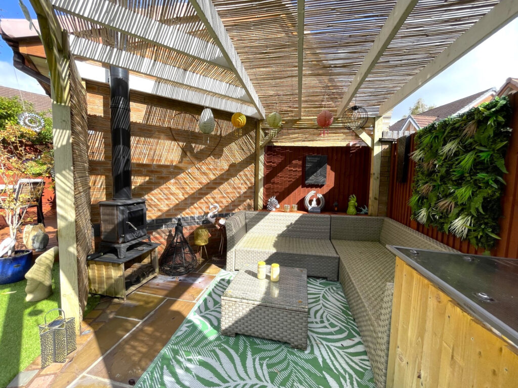 The property is well maintained and offers four good-sized bedrooms, a spacious lounge, a kitchen-diner with external access to the side of the house, a downstairs WC, and a central staircase connecting the ground and first floors. A conservatory extension at the rear provides additional living space, ideal for relaxing or entertaining guests, while the east-facing garden includes a lovely seating area with an attached log burner, perfect for enjoying outdoor evenings or family gatherings.