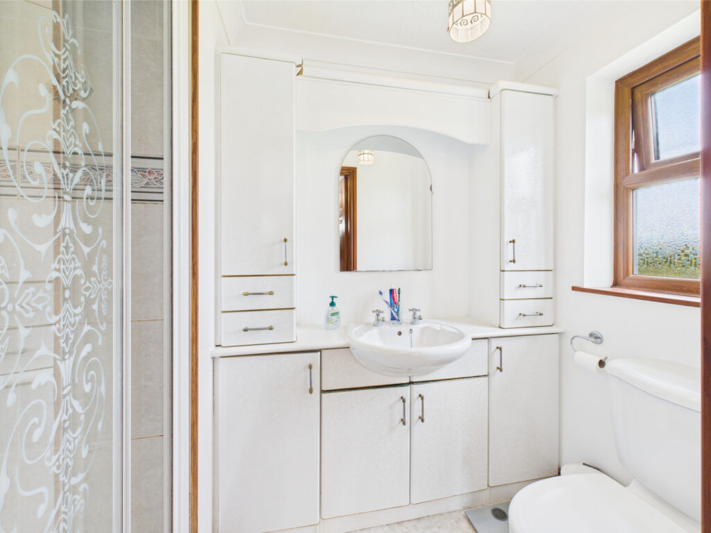 Upstairs, the home continues to impress. The principal bedroom features fitted wardrobes and a stylish three-piece en-suite, complete with a step-in shower, vanity unit with wash hand basin, and low-level WC. Three further bedrooms, all beautifully decorated, offer flexible options for children, guests, or home working. A spacious family bathroom completes the upper floor, featuring a panelled bath, pedestal wash basin, and WC—finished in a clean, neutral style.