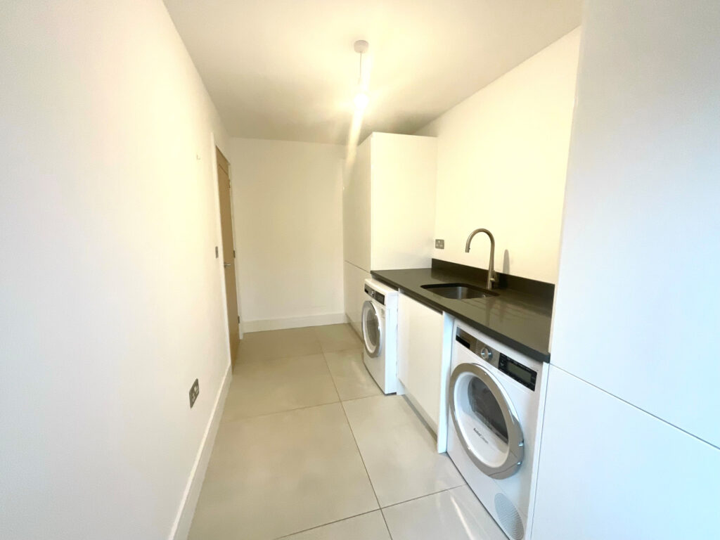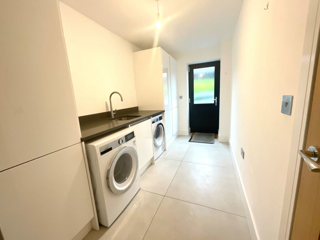 The heart of the home is undoubtedly the open-plan kitchen, dining, and family living area — an exquisite space designed for entertaining and everyday living. This stunning kitchen boasts top-quality units, Bosch appliances including a double oven and extractor, and an abundance of storage. There is an integrated fridge-freezer and dishwasher, while the utility room provides an additional integrated fridge-freezer, washing machine, dryer, and sink, ensuring practicality matches the impeccable style.