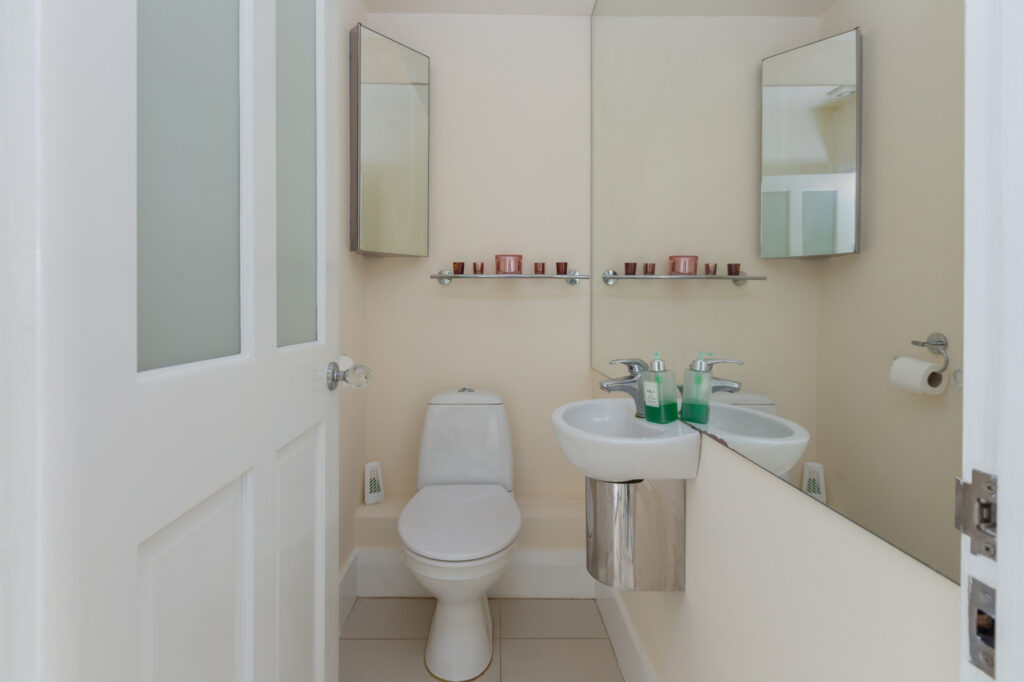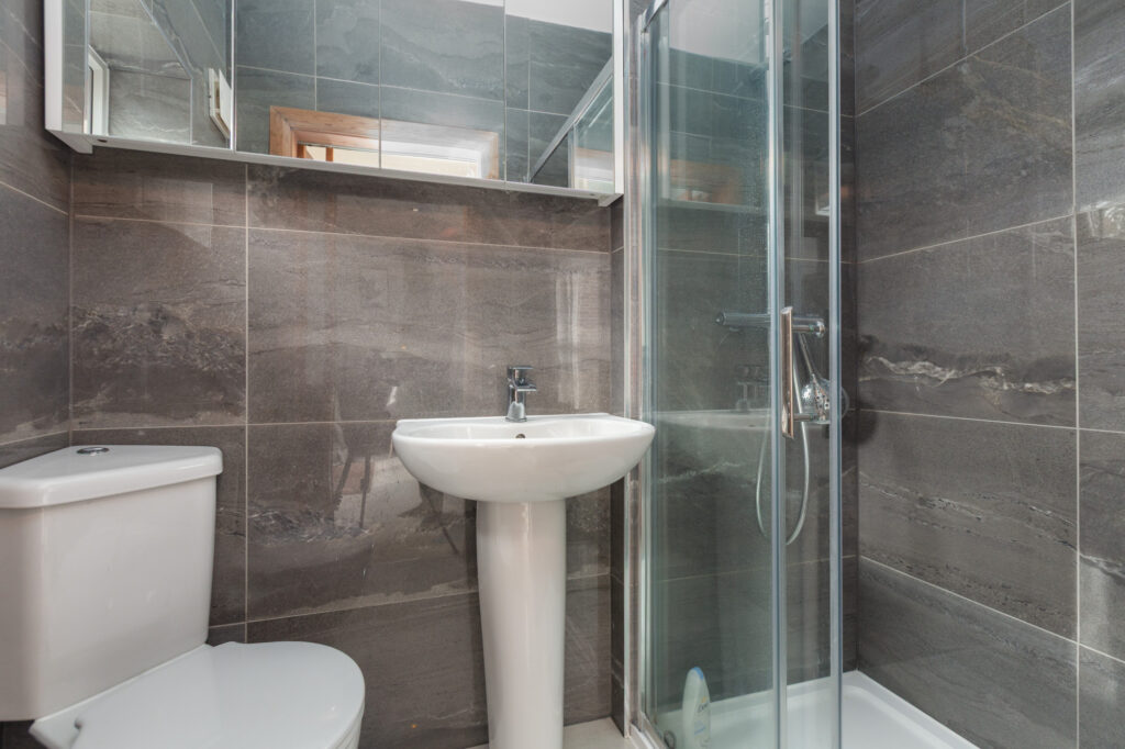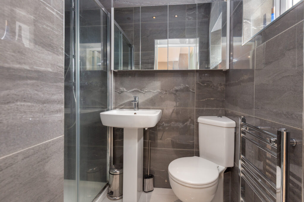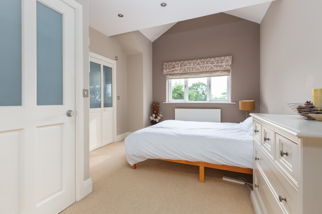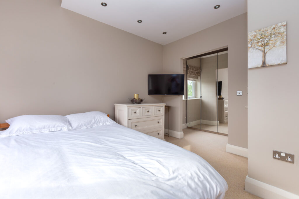 The master bedroom enjoys peaceful rear views and includes a dressing area with mirrored fitted wardrobes and a well-appointed ensuite featuring a thermostatic shower, pedestal sink, low flush WC, towel radiator, and part-tiled walls.