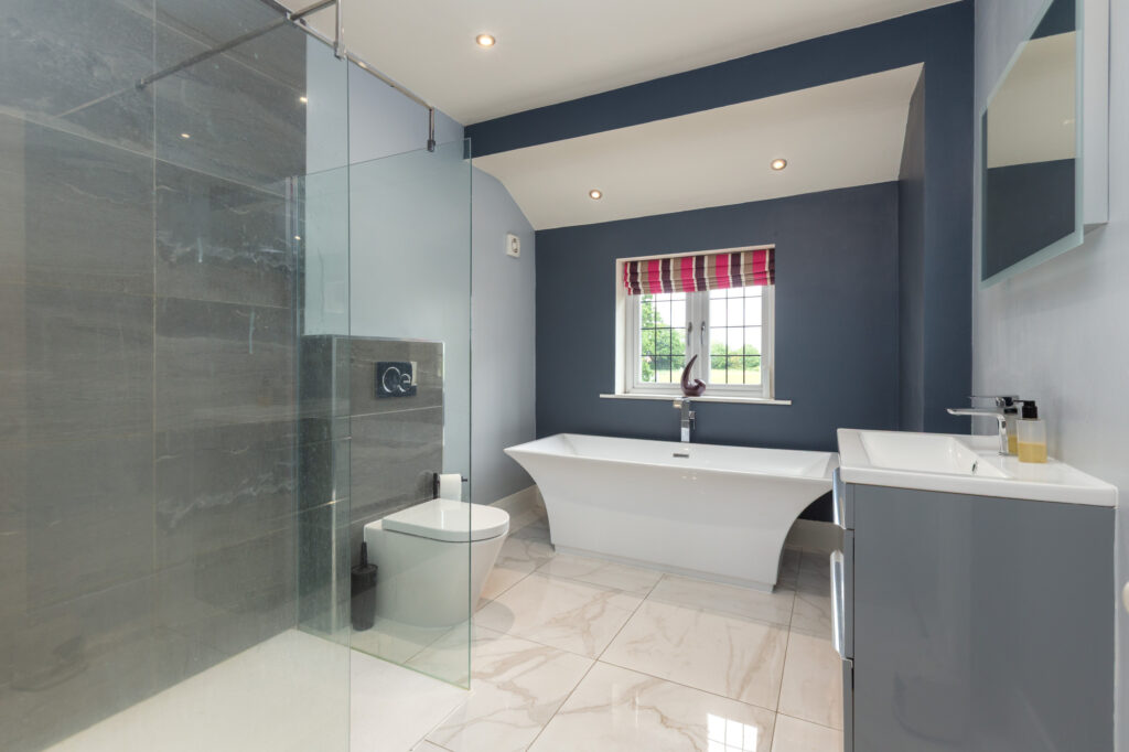 The luxurious family bathroom completes the first floor with a panelled bath, separate power shower cubicle, vanity sink with drawers, fitted mirror with lighting, low flush WC, towel radiator, tiled flooring, and ceiling spotlights.
