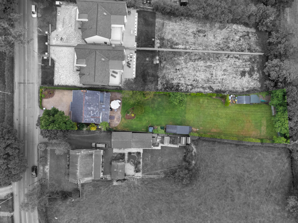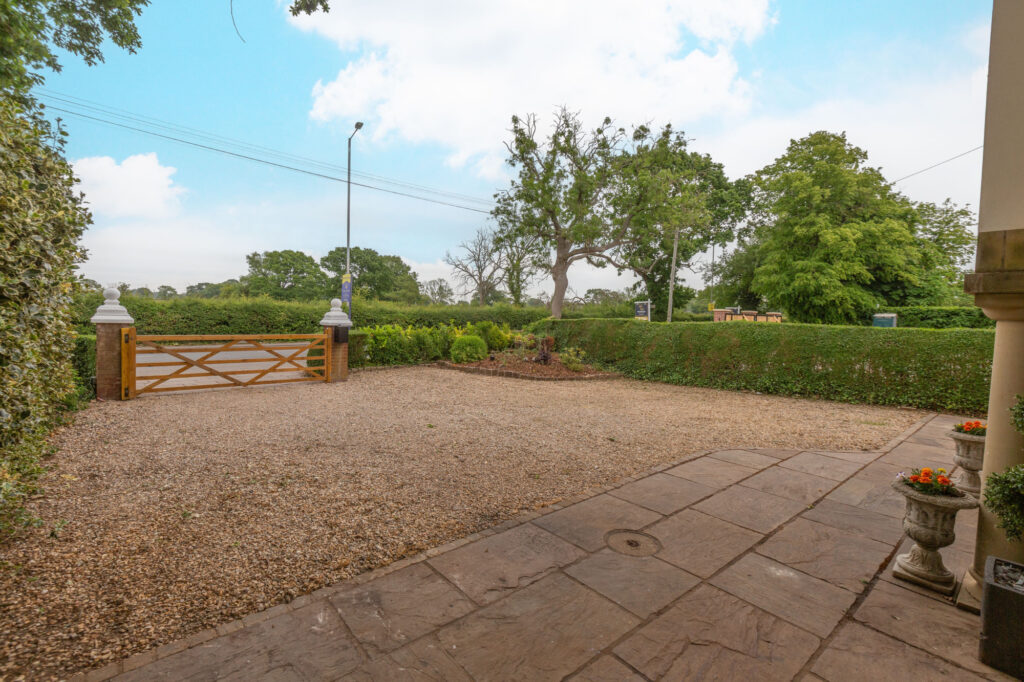 To the front, a generous gravel driveway offers off-road parking for several vehicles and is bordered by mature hedging. Power is supplied to the front gates for future automation or lighting installations.