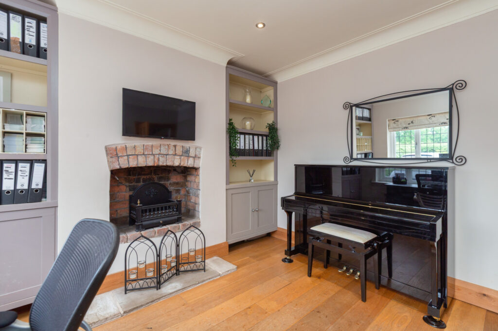 At the front of the home, a flexible reception room currently serves as a study, complete with built-in shelving and cupboards, an exposed brick fireplace recess, TV point, radiator, and a leaded double-glazed window with fitted blinds.