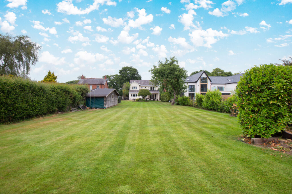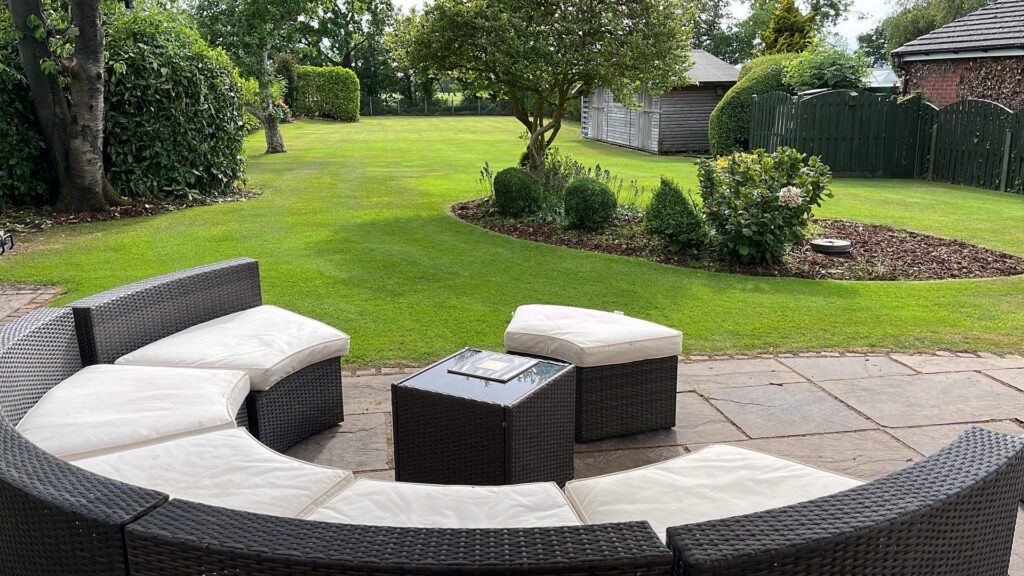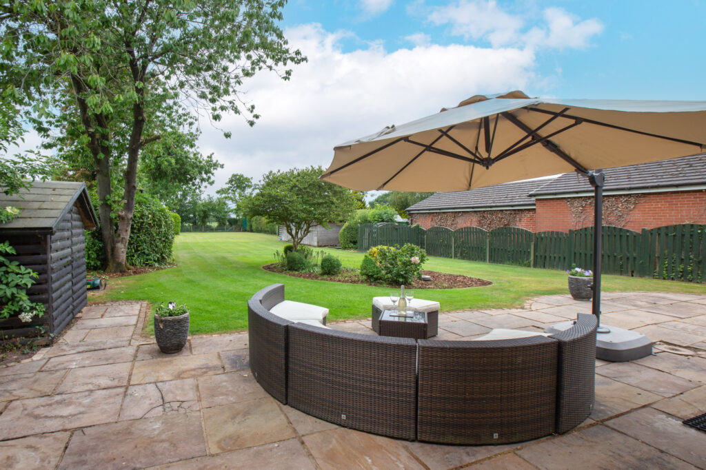 The private rear garden is beautifully landscaped with a spacious lawn, full drainage system, established borders, mature trees, and a wrap-around stone patio — ideal for relaxing, entertaining, and al fresco dining. Two garden sheds provide ample outdoor storage, with power supplied to the larger shed.