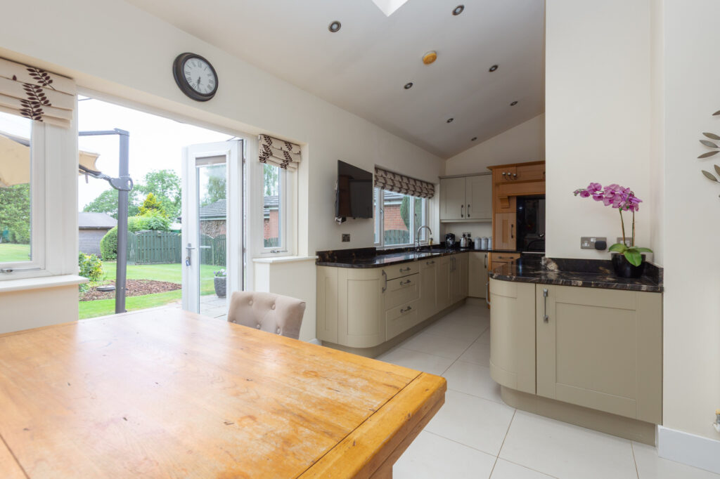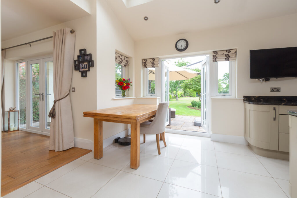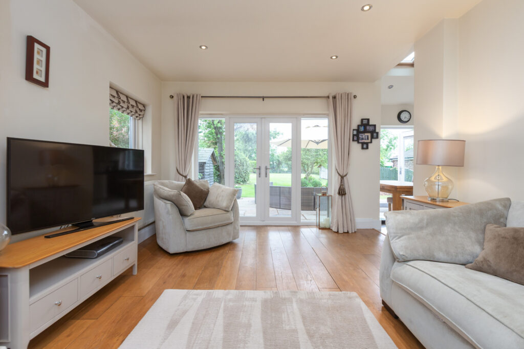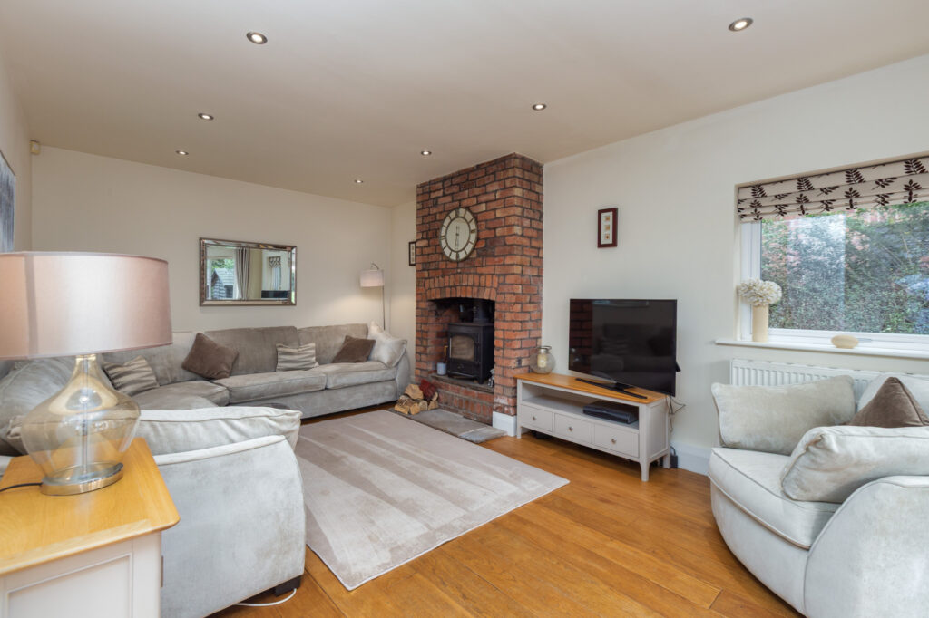 Flowing seamlessly from the dining space through a wide archway is the spacious lounge, where a striking brick feature fireplace with multi-fuel burner creates a warm and inviting atmosphere. Additional French doors open onto the rear patio, ideal for entertaining and indoor-outdoor living.