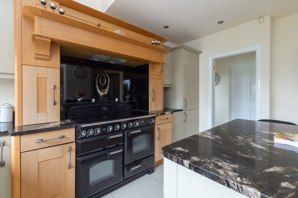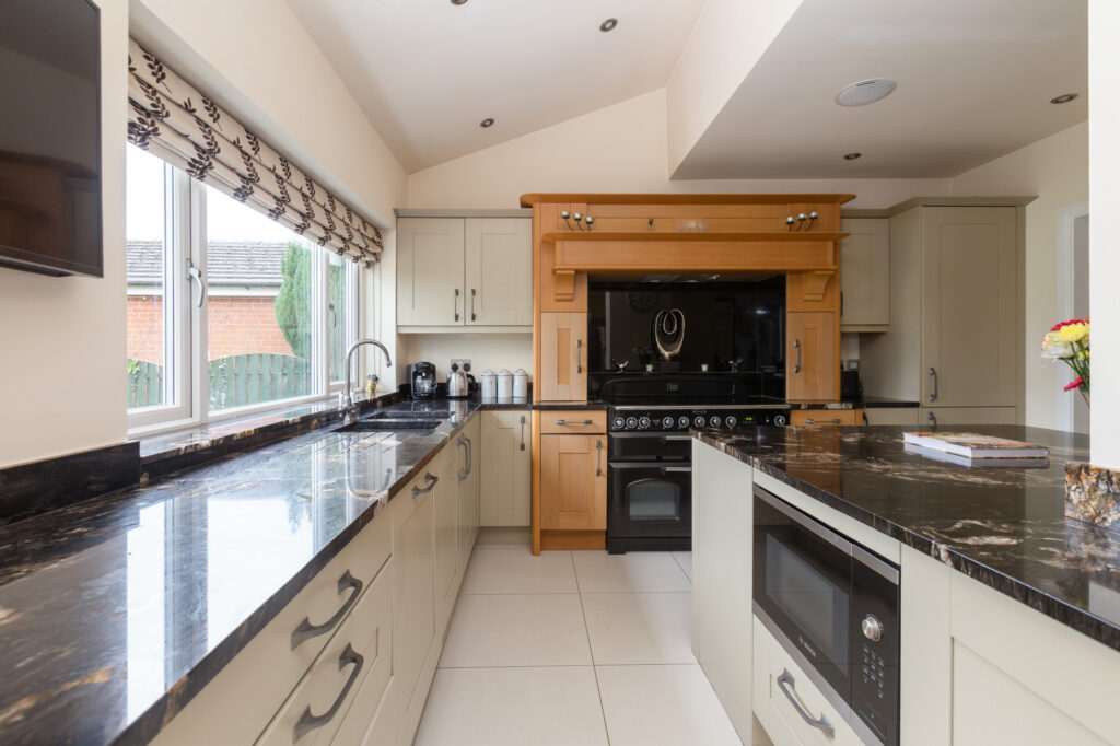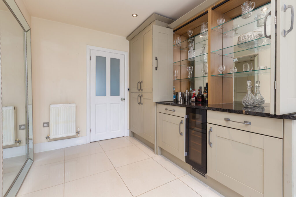 The heart of the home is the stunning open-plan kitchen and dining area — a true showpiece. Bathed in natural light from multiple skylights, French doors, and large windows with bespoke blinds, this space features a bespoke central island with granite worktops and breakfast bar, double sink, and an extensive range of soft-close base and wall units. High-end integrated appliances include a Rangemaster-style cooker with extractor canopy, microwave, dishwasher, fridge/freezer, wine cooler, and a dedicated glassware and drinks cabinet with mirrored backdrop.