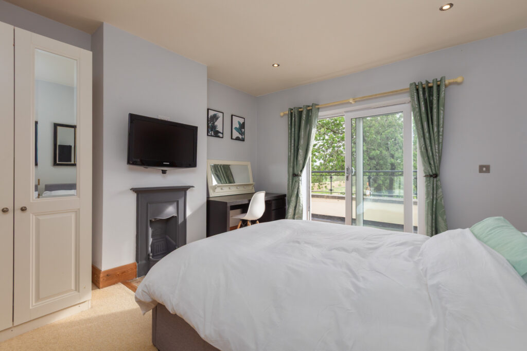Bedroom two also overlooks the rear garden and features a private balcony — a rare and standout feature — as well as spotlighting, TV point, and a matching ensuite shower room.