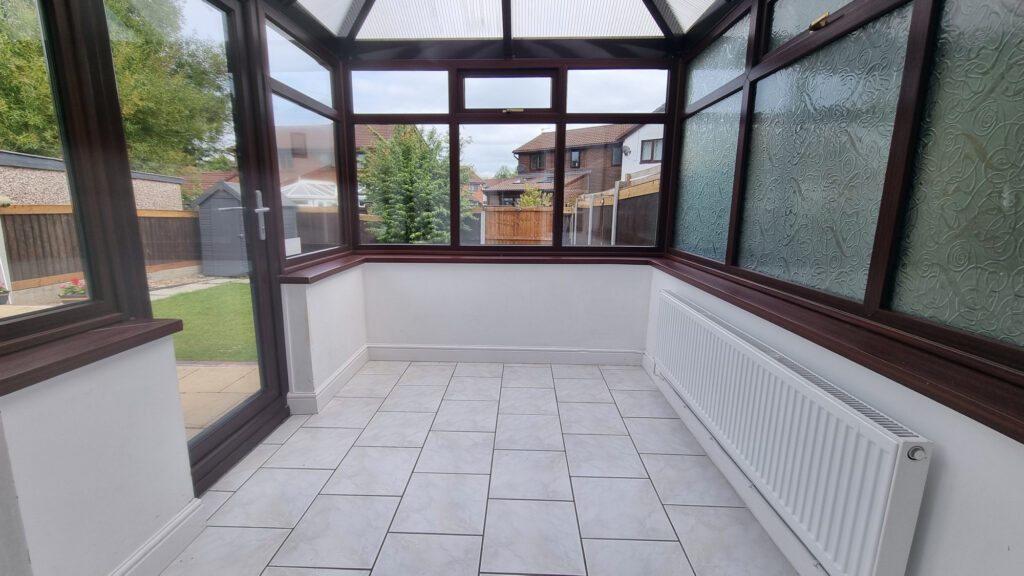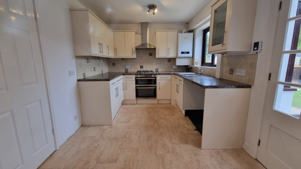 kitchen with fitted base and wall units and fitted appliances. And access to the garden area via conservatory