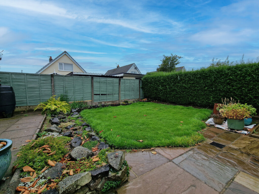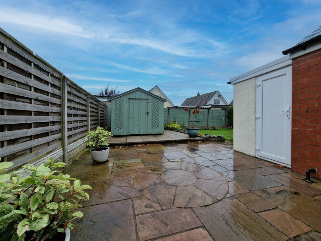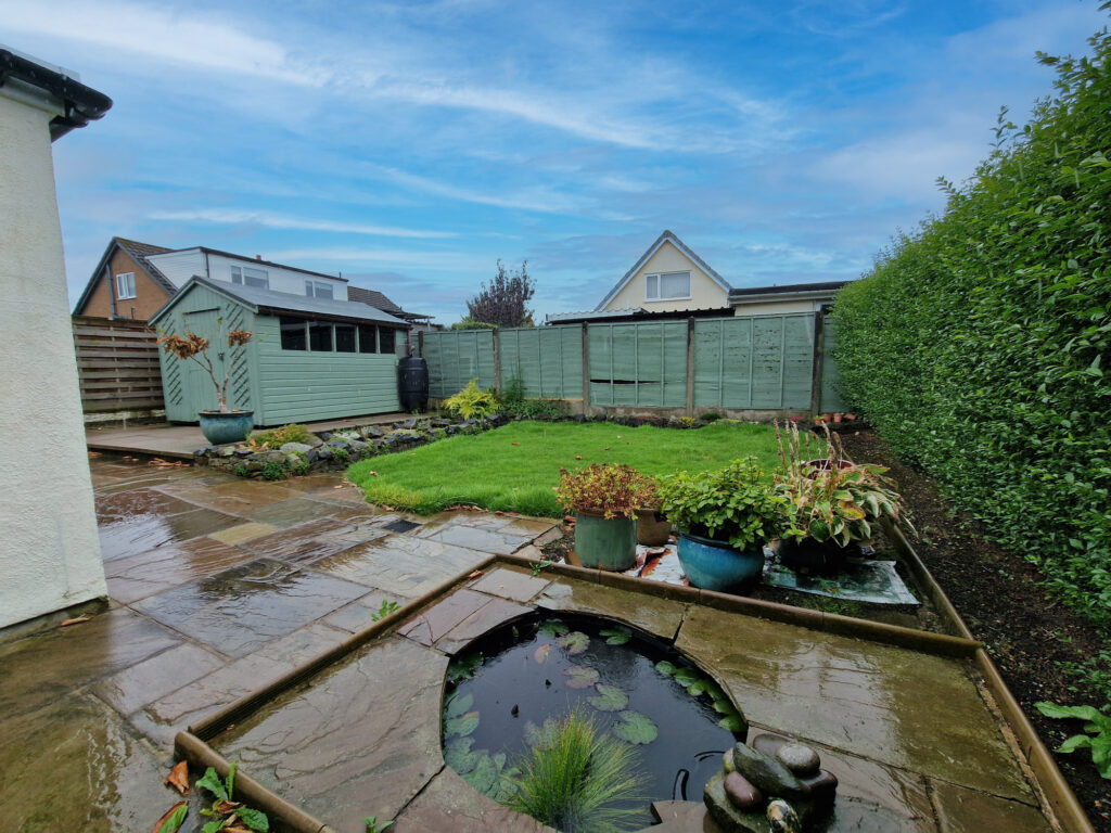 Step outside into the charming garden, where you'll find a well-kept lawn complemented by a soothing water feature. There's also a garden shed, providing additional storage space.