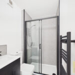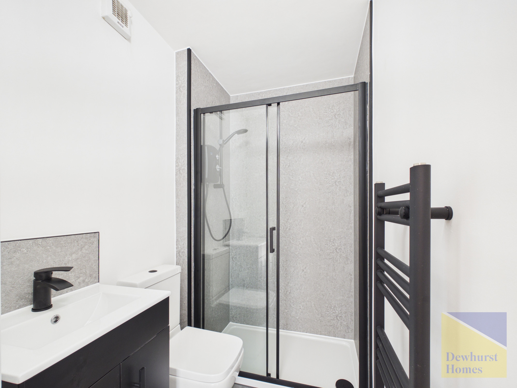 The en suite shower room is beautifully appointed, featuring a panelled shower cubicle, low-flush WC, and elegant black fittings with a waterfall tap. A contemporary vanity unit, stylish ladder-style towel rail, and discreet extractor fan complete this sophisticated and modern sanctuary.