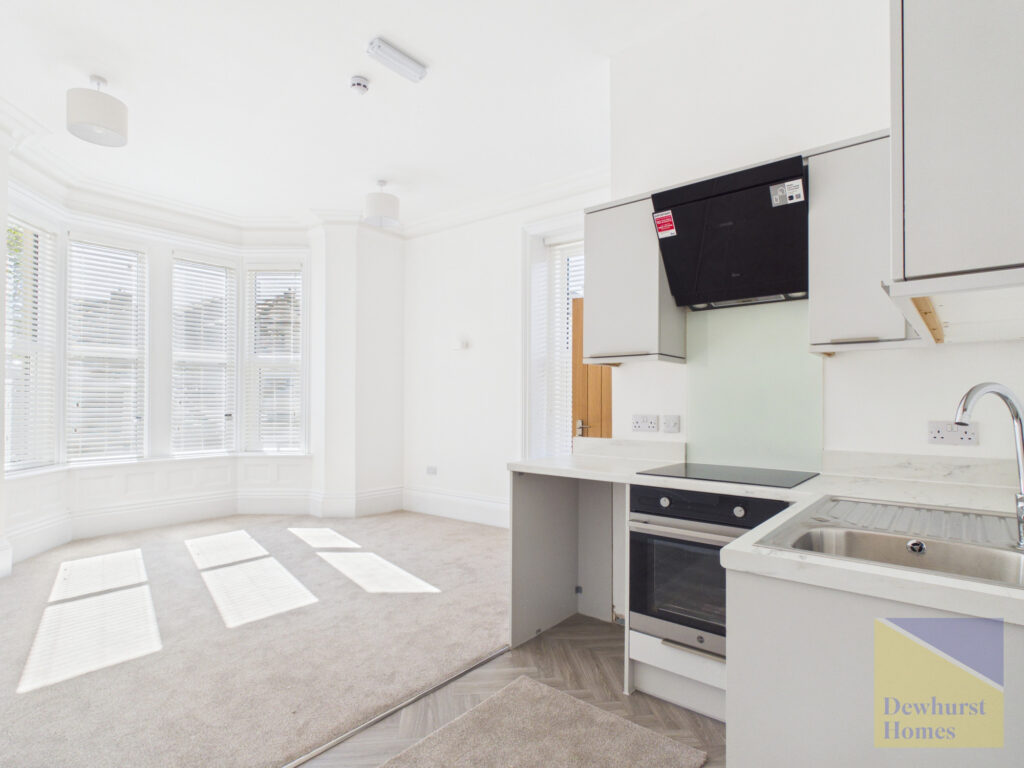 The luxurious studio apartment offers a spacious living area with an integrated kitchen fitted with modern appliances. A beautiful bay window floods the space with natural light, highlighting the high ceilings and exquisite period features throughout.