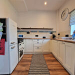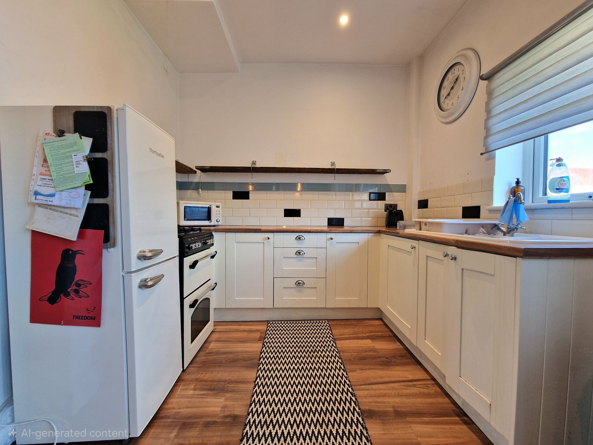 Double glazed patio doors, double glazed window, ceiling light points, ceiling spotlights, base units, sink with drainer, partially tiled walls, vertical radiators and laminate flooring.
