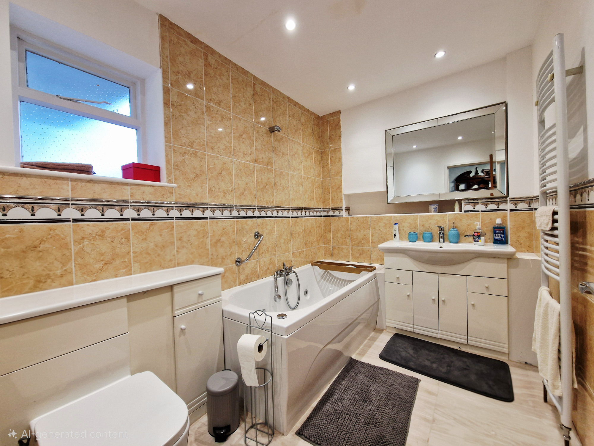 Ceiling light point, Radiator, Three piece bathroom piece with hand wash basin and toilet. Part tiled walls.